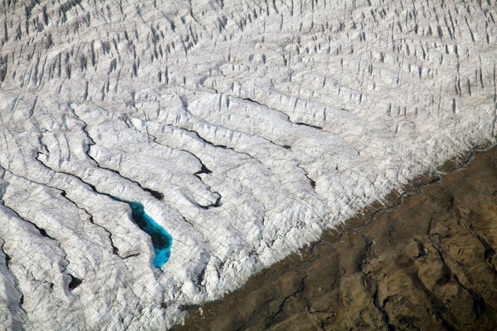 As we circled over the glaciers terminal moraine, we could see how the majority of the water leaving the northward sloping Slims Valley was now flowing south. This left the Slims River’s bed largely free of water and this sudden aridity of the east end of Kluane Lake has been the site of intense dust storms.
