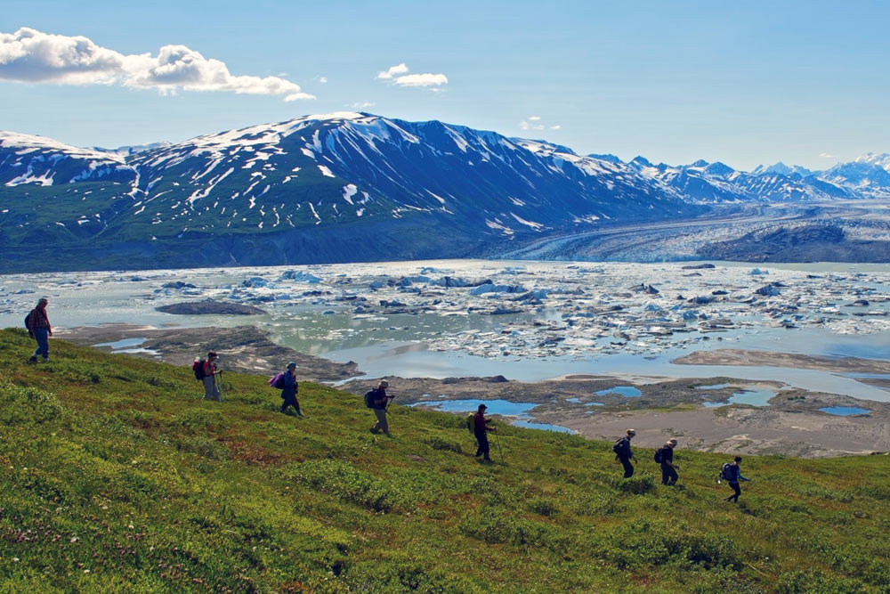Golden eagles soar over the slopes looking for unwary Arctic ground squirrels. A rainbow of wildflowers carpets the alpine meadows. The guides will split up to accompany some to the top of the plateau, others to the lower flanks and meadows and also others for a ramble along the gentle iceberg-studded shoreline of Lowell Lake.